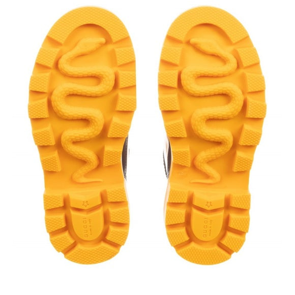 Gucci Kids Yellow Patent Wool Liner Ankle Rain Boots. They are bright yellow with black accents on the toe and sole, and a plush, cream-colored wool lining. The boots have a front zipper closure and a lug sole for traction. The brand name "GUCCI" is visible on the box the boots are placed on. These boots are designed for children and are suitable for wet weather conditions due to their waterproof patent leather exterior and the functional design.