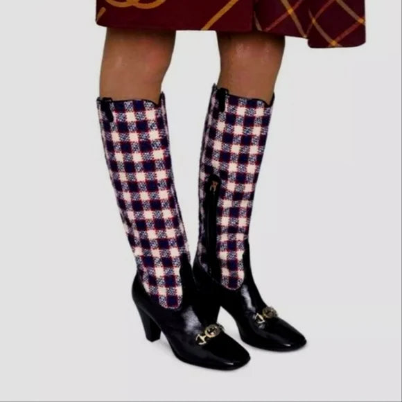 Tri Color Tweed Web Accent GG Horsebit Knee High Riding Boots Size 7.5