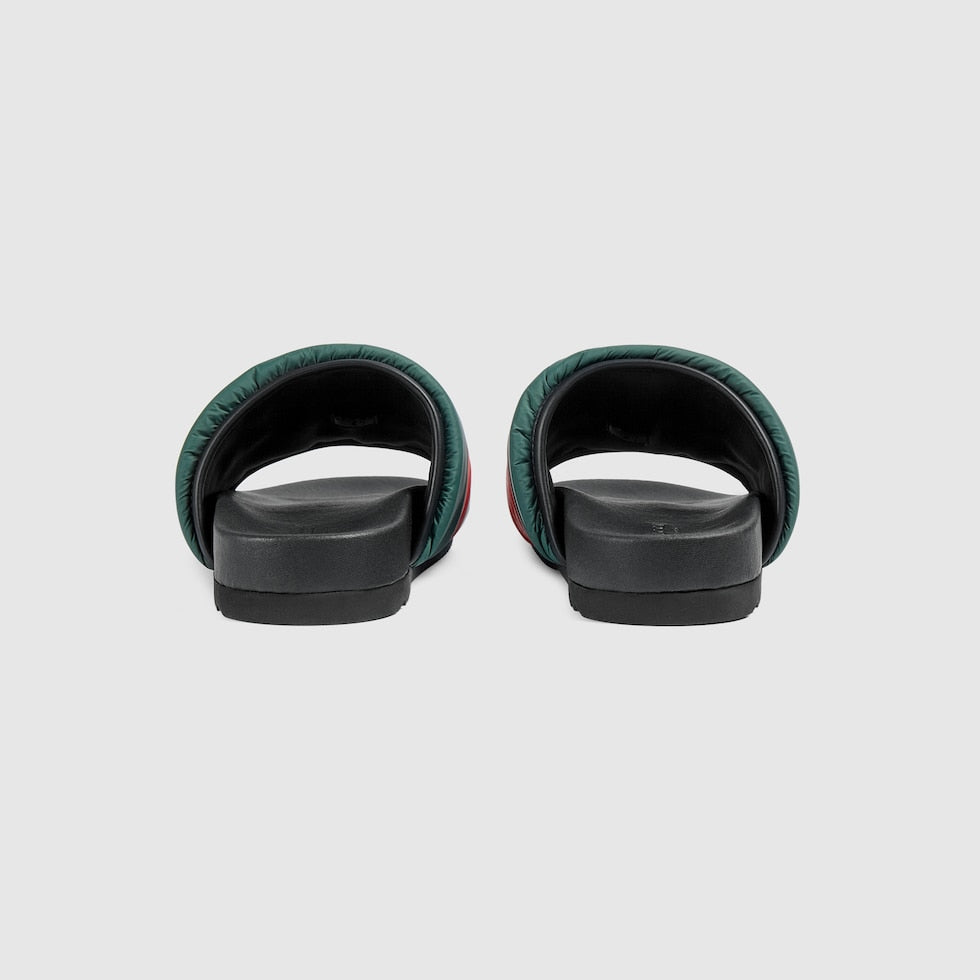 Recalling outerwear, this pair of slide sandals is a new interpretation of padded nylon. The oversize material stands out in green and red, the colors of the House Web.
